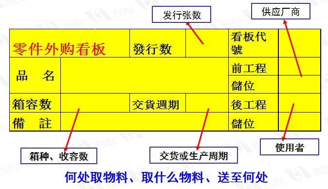 (1)一般看板:成品交貨看板;成品領(lǐng)取看板;成品裝配看板;零件取用看板;零件加工看板;在制品信號(hào)看板;零件購(gòu)入看板。