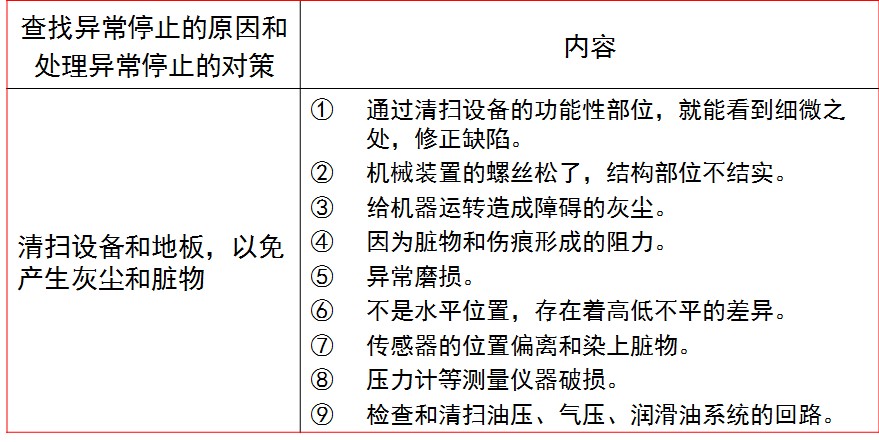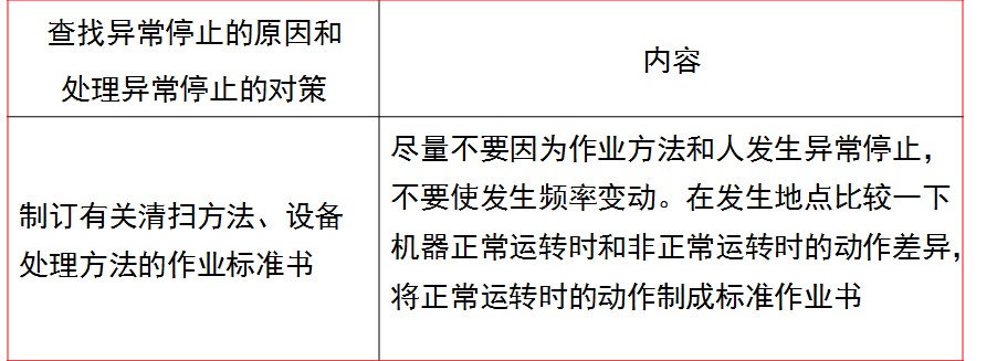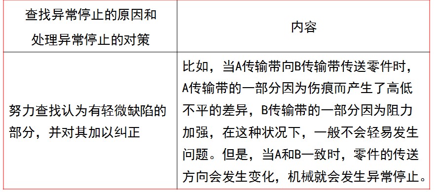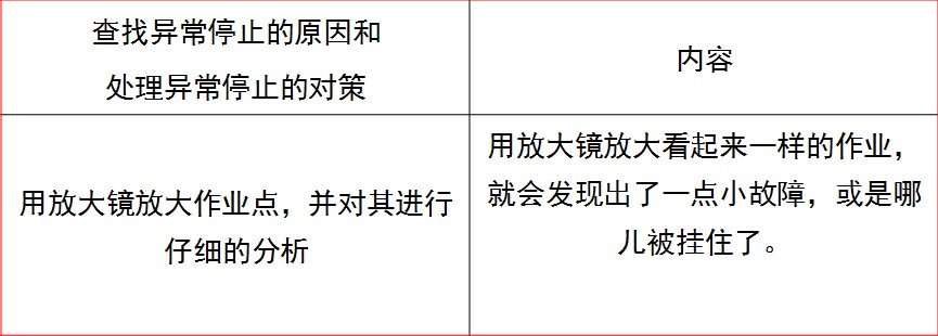 三、處理異常停止的對策 所謂異常停止是指:發(fā)生一點問題,作業(yè)就會輕易停止的現(xiàn)象。 1、異常停止的特點 (1) 因為經(jīng)常發(fā)生異常停止,所以不能獲取準確的資料。 (2) 很多時候都是再啟動一下機器,就那樣當場解決了,所以不能查找出問題原因,因此不能實施防止再次發(fā)生異常停止的對策。 (3) 有時候是因為細小的缺陷相互作用而造成了異常停止,這些缺陷難以被人發(fā)現(xiàn)。 (4) 很難把握發(fā)生問題場所的情況,所以經(jīng)常是慢性發(fā)生。 2、查找異常停止的原因和處理異常停止的對策